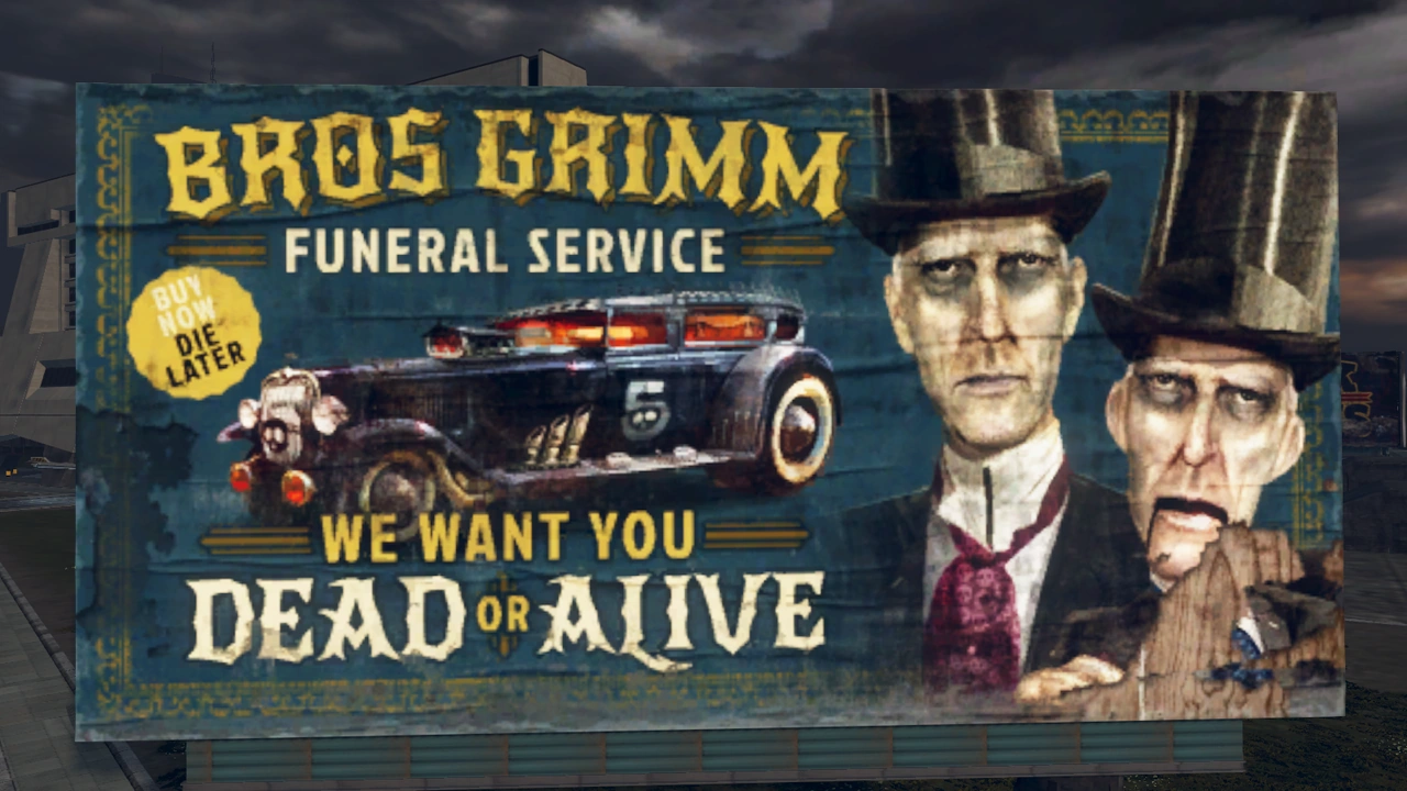 The Brother's Grimm have a billboard advertising their services in Bleak City.