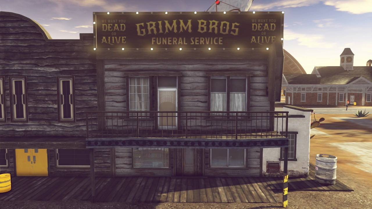The Brother's Grimm Funeral Services building is at Devil's Canyon, a part of the Ill Eagle desert.