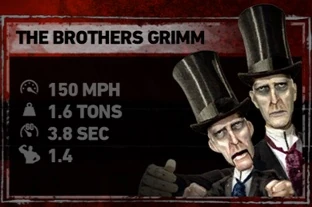 | "Grimm brother #1` lost Grimm brother #2 while racing to a cemetery. How ironic. Now he sticks his hand up his dummy brother’s rear and pretends he’s still here, while his deceased sibling resides in the coffin in the back of the Stiffshifter." | |